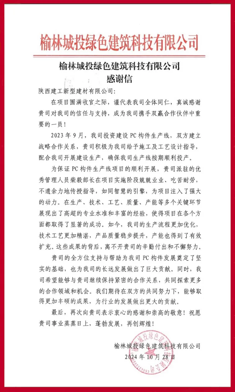 柴毅有多岗位工作经历,派驻过程中为合作伙伴在生产流程、技术工艺、产品质量和产能提升等方面不遗余力地传授指导。他的辛勤付出和不懈努力,不仅赢得了合作伙伴的高度赞誉,更为我司赢得了良好的业界口碑。为此,榆林城投绿色建筑科技有限公司特向我司发来感谢信,并赠送写有“精诚合作,攻坚克难”的锦旗,以表达对我司及柴毅的深深谢意。