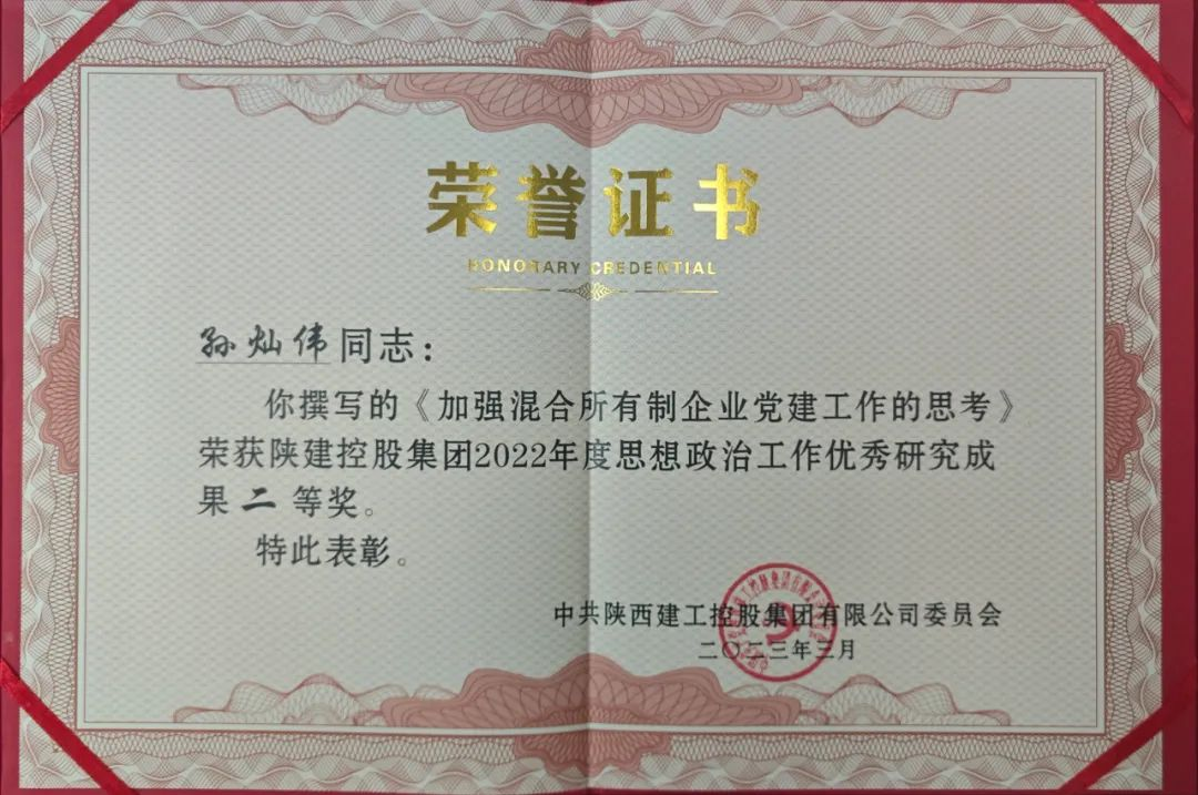 4月3日,陕建控股集团 2023 年宣传思想文化统战工作座谈会在西安召开。陕建产投集团报送的研究成果《加强混合所有制企业党建工作的思考》,被授予陕建控股集团2022年度思想政治优秀研究成果二等奖。