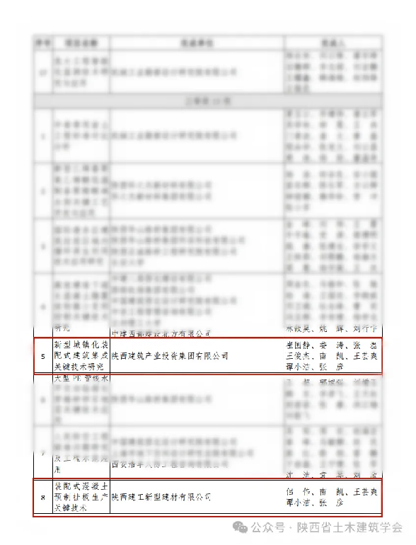 近日,陕西省土木建筑学会公示了“第九届(2024年)陕西省土木建筑科技进步奖评选结果公示”名单,陕西建筑产业投资及所属企业新型建材公司完成的《基于湿陷性黄土地质的综合管廊快速建造关键技术研究与应用》荣获二等奖,《装配式混凝土预制挂板生产关键技术》《新型城镇化装配式建筑集成关键技术研究》荣获三等奖。