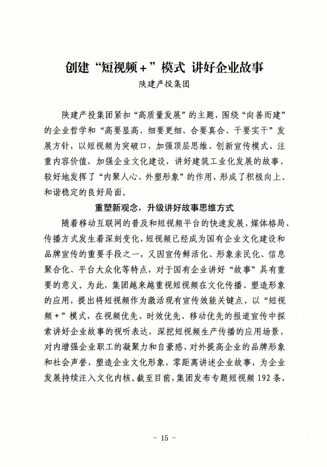 截至目前,集团发布专题短视频220条,被学习强国平台选用10条,各视频平台累计播放量达200万次、点赞量近10万;陕西省国资委印发的第5期“企业文化建设专项提升行动工作简报”,对集团“短视频+”模式进行了重点经验分享。