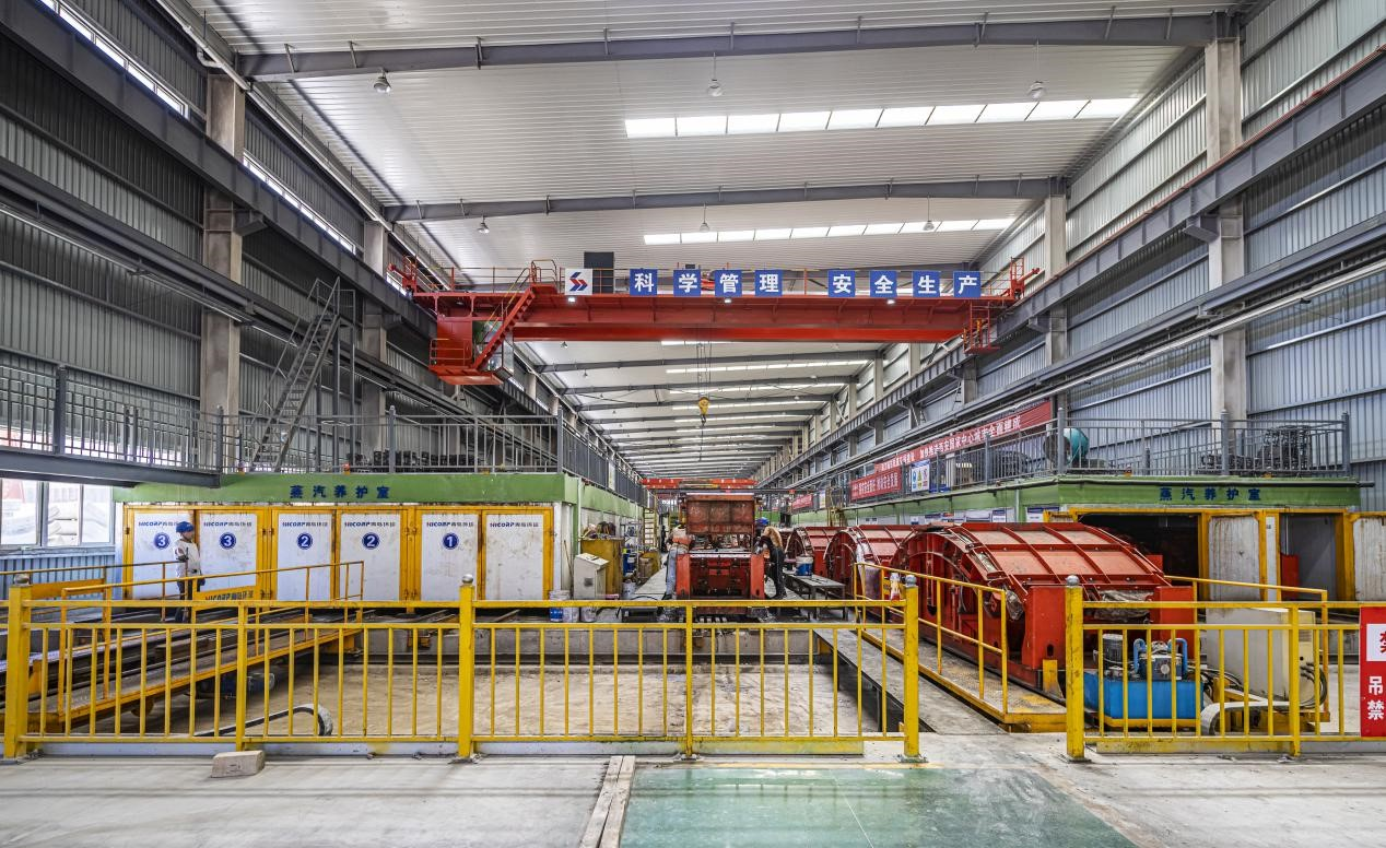 在位于陕西省西安市秦汉新城的陕建新型建材公司生产车间内,一派热火朝天的繁忙景象:从事钢筋绑扎、混凝土布料、蒸养、倒运等工作的工人们头顶安全帽干劲十足,作业台上机械臂左右开弓,场内运输车往来穿梭,人声与机器转动声相互交织,汇成了一首铿锵有力的生产进行曲。