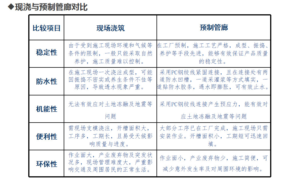 预制综合管廊可以有效提高土地集约化使用,兼顾城市发展的“面子”和“里子”,进一步补齐地下基础设施建设“短板”,与传统工艺相比,预制综合管廊大大减少反复开挖导致的“马路拉链”现象,也无需担心造成城市拥堵,满足民生基本需求,提升城市综合承载力。