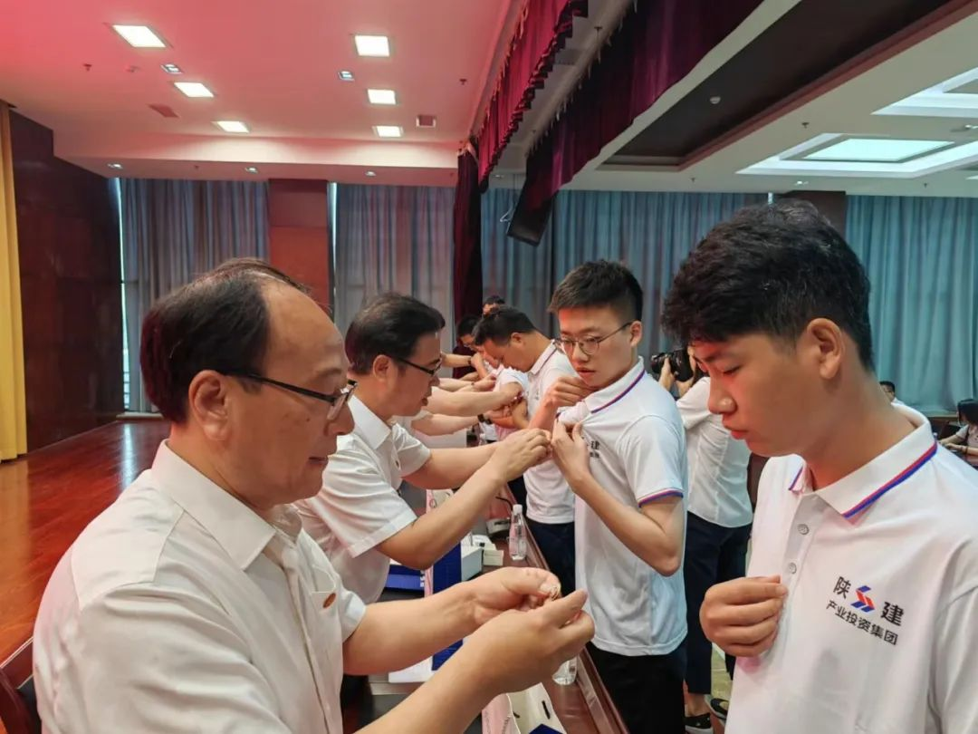 开班仪式期间,集团领导班子成员为新员工代表佩戴司徽,并赠送入职大礼包。